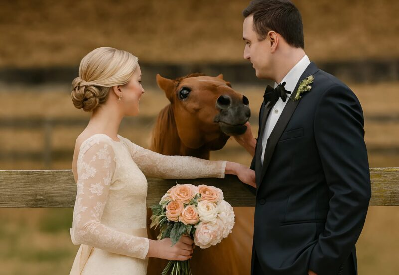 Meu noivo não se opôs à ideia — pelo contrário, disse que as fotos com o cavalo seriam únicas e românticas. Tudo estava indo perfeitamente: uma brisa suave, a luz da manhã, o fotógrafo dando instruções. Mas assim que nos aproximamos da cerca e ficamos ao lado do cavalo, ela de repente começou a relinchar alto, bater os cascos, sacudir a cabeça e até mesmo empurrar meu noivo no peito com o focinho.