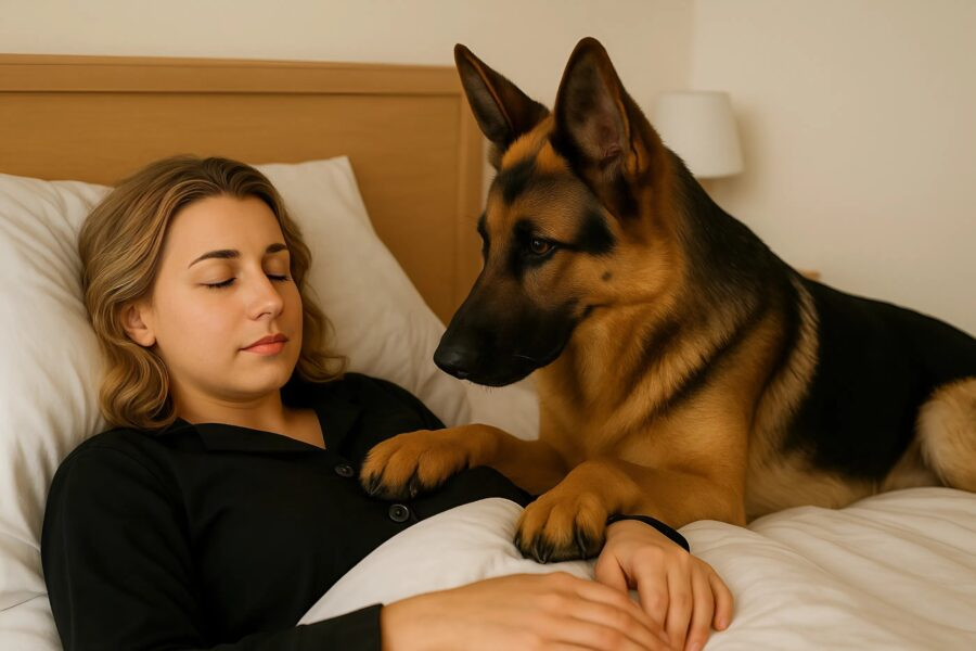 “Deixa eu dormir um pouquinho”, murmurei, esperando que ele entendesse. Mas ele não parou. Em vez disso, colocou a pata no meu peito e começou a me sacudir delicadamente, olhando diretamente nos meus olhos.