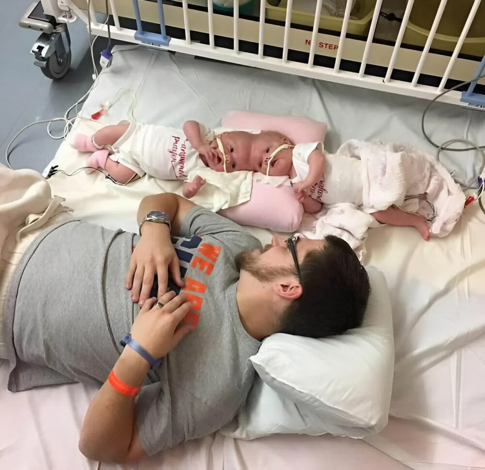 Pesando cerca de 2,7 kg ao nascer, os gêmeos foram imediatamente colocados na unidade de terapia intensiva neonatal antes de serem operados em junho de 2017.