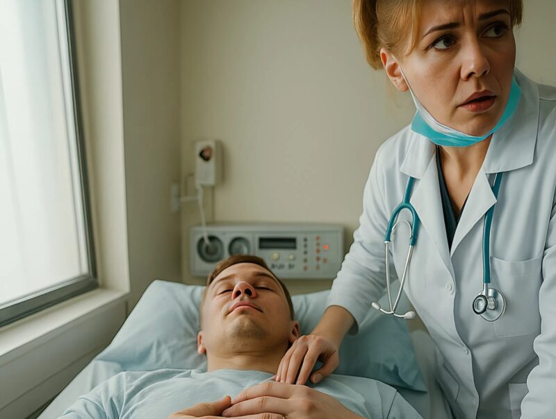 Ela olhou para a porta — vazia. Silêncio. Apenas o zumbido fraco das luzes acima dela. Com os dedos trêmulos, inclinou-se sobre o homem e tocou cuidadosamente sua mão para remover o anel. Mas naquele exato momento, algo inesperado aconteceu que a fez congelar de horror 😱😨