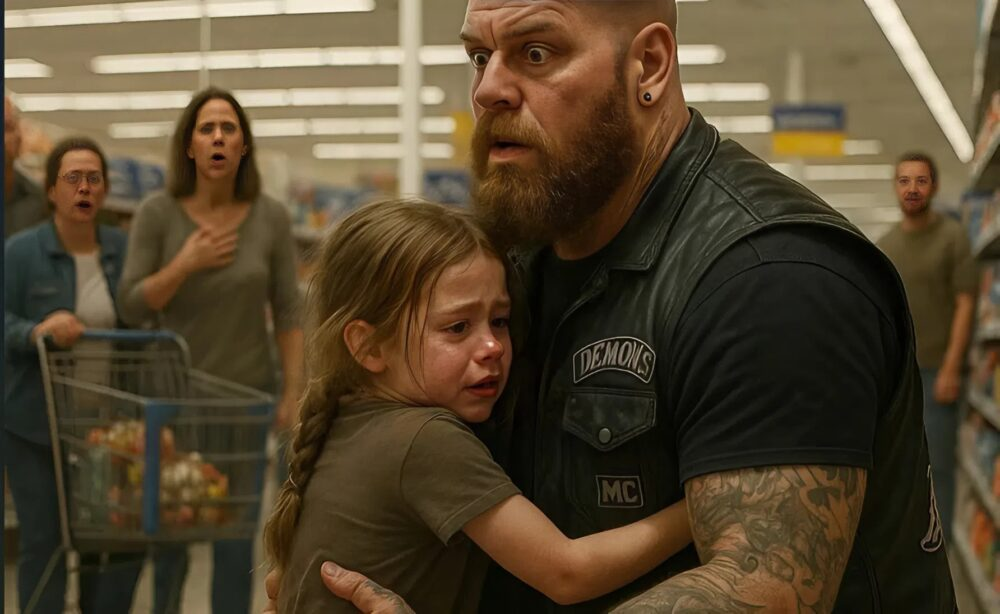 Então, num gesto que pareceu desesperado, ela correu em direção ao maior homem da loja. Um gigante, coberto de tatuagens, vestindo um colete de couro com as palavras “Demons MC” escritas. A cena causou um arrepio instantâneo: os clientes se afastaram, as mães puxaram seus filhos para mais perto, o ar ficou mais denso. Todos esperavam uma cena violenta.
