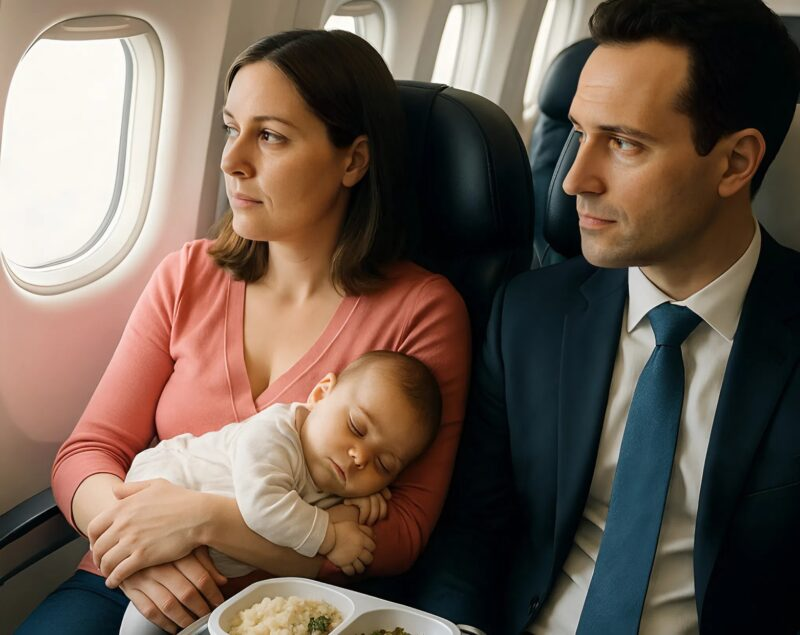 Viajei de avião com meu filho de dois meses, que chorou constantemente durante o voo: meu vizinho não gostou, e então, de repente, ele fez isso…
