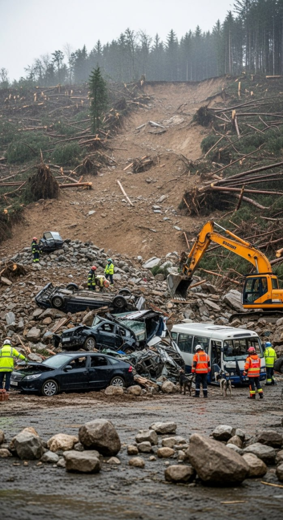 O vídeo começa com uma cena apocalíptica: uma vasta encosta foi arrasada, árvores arrancadas e uma enorme quantidade de lama e pedras despencou, soterrando um trecho da estrada. A imagem do caos é clara, com carros esmagados e completamente deformados, e um pequeno ônibus preso nos escombros.