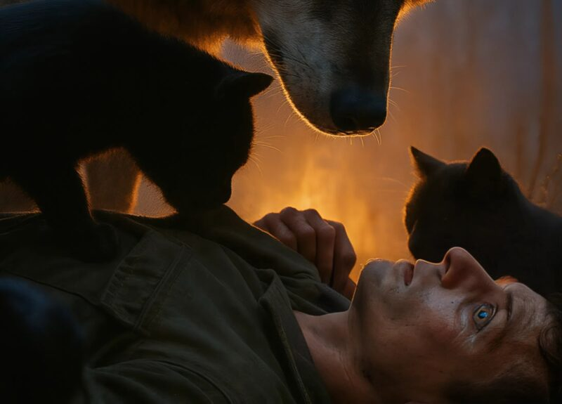 The man couldn’t believe his eyes. He lay motionless while the animals seemed to embrace him, pressing their warm bodies against his. The wolf lay beside him, breathing heavily but calmly, warming him with her body.